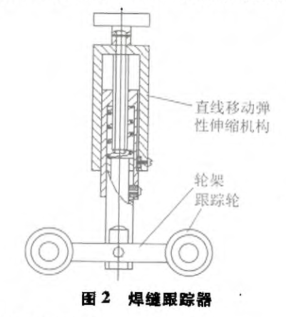 焊縫跟蹤器是保證焊接質量的關鍵部件,依靠它為焊接小車行走強制導向,從而保證焊槍2始終不偏離焊縫。它由兩個導向輪、一個輪架、一套直線移動彈性伸縮機構組成,結構如圖2所示。焊縫跟蹤器7通過豎直調整夾具9與安裝在焊接小車前端的水平調整裝置8相連。工作時焊縫跟蹤器的兩個跟蹤輪騎在焊縫中,依靠焊縫為其導向,并在彈性壓力下,兩輪始終沿焊縫滾動,通過機械強制力使焊接小車跟隨其始終與焊縫保持等距行走。