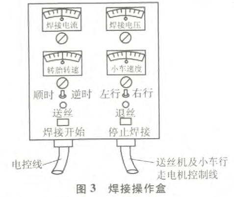 (1)在焊接操作盒lO上按下“焊接開始”按鈕,焊接開始。此時焊接小車按預先設定的焊接方向和焊接速度行走,同時轉胎5也隨之反向同步轉動。