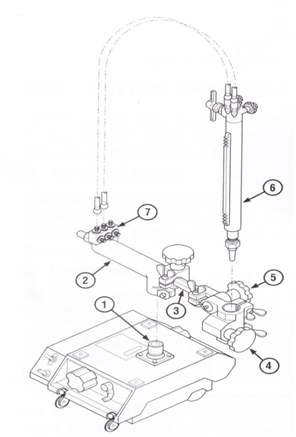 (7)插入到齒條手柄組件的一端。將適當的軟管接頭旋進歧管檔塊的入口。在中心對孔使用燃氣軟管接頭,在外側兩對孔使用氧氣軟管接頭。將所需的軟管從歧管檔塊連接到割炬。如果使用的是雙管割炬,忽略右側軟管。