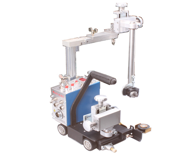 HK-5B-II型小車是適用于間斷或者連續的水平角焊結構的雙面焊接自動裝置。焊接/非焊接區間的實際距離顯示屏上,用扳動開關的上下調節,設定焊接與非焊接的距離,焊接與非焊接的距離是用電機與控制器控制,尺寸的精密度高,運行速度均勻,可實現精密焊接。非焊接狀態下的小車行走速度為最大值(1900mm./min)。手柄為磁控式,移動此手柄可以部分的減少磁力,便于清理鐵質垃圾和移動小車。設有收弧裝置,收弧時間調節范圍在0-7 S??梢韵蜃笥覂煞较蚝附?;小車兩端安裝有感應停止開關,焊接結束后小車可以自動停止,便于一個工人同時操縱多臺設備。安裝有永久磁鐵,避免小車脫離焊接線的現象。焊槍支架長度和高度可以根據工件形狀進行調節,使用方便體積小、重量輕,移動和安裝都很方便。
