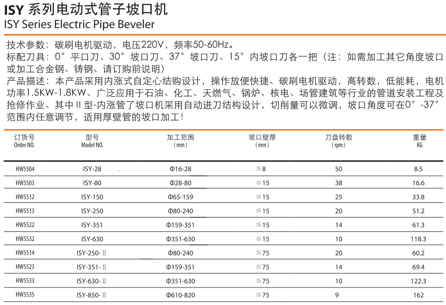 ISY系列內漲式電動管子坡口機是本公司研制的輕便型的鋼管坡口加工機具。該系列坡口機專為內徑為Φ28~Φ360mm的鋼管倒角而設計。本系列鋼管坡口機,采用交流220V電機作為動力,內漲式結構,自鋼管中心,操作方便。全新的設計理念和造型、卓越的使用性能,使其處于國內坡口加工技術的領先地位。本機可對鋼管進行坡口、平面法蘭加工。無論管壁厚薄,其加工性能與效率比起傳統工藝都有著不可替代的優勢。