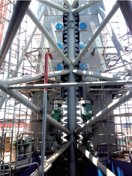 自升式鉆井平臺的樁腿部分支撐著整個平臺的重量,不但材料強度要求高,而且結構設計上有大量的斜撐管,以增加樁腿部分的強度和穩定性,滿足設計要求,如上圖所示。在直徑只有520mm,厚度為25mm、28mm、50mm主弦管上,密布了大量φ 114~φ 273mm、厚度不等的斜撐管,在局部區域節點多,焊縫密集,而且焊接需要單面焊雙面成形,這就對坡口的精密高效加工提出了要求。鋼管與鋼管在空間以一定角度交成的空間曲線(即相貫線)坡口加工比較困難,傳統的手工加工方法不僅效率低,而且產品加工質量很難得到保證,影響后面工件的焊接質量和空間幾何尺寸。為此,我公司引進了上海華威焊割機械有限公司的的XG-630數控相貫線切割機,不僅提高了工作效率,而且保證了相貫線坡口加工質量。