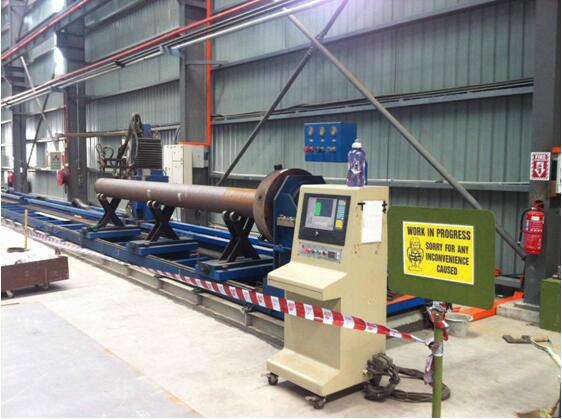 優(yōu)缺點(diǎn):華威切割機(jī)不僅生產(chǎn)效率高、勞動(dòng)強(qiáng)度低,而且切割精度高,切割后的桿件口型準(zhǔn)確,質(zhì)量較高,減少了相貫線坡口的打磨修復(fù)工作。通過控制臺(tái)的數(shù)控系統(tǒng),裝在機(jī)器上的割炬按照輸入的切割參數(shù)進(jìn)行平面幾何運(yùn)動(dòng),只需要調(diào)整割炬的高度、火焰的大小及機(jī)器的行走速度來實(shí)現(xiàn)鋼管的連續(xù)切割。管徑大于Φ406mm 的鋼管一般是卷制管,必然會(huì)存在縱向焊縫。而金鳳切割機(jī)在切割過程中鋼管是始終處在滾輪上面的,滾輪在徑向轉(zhuǎn)動(dòng)過程中會(huì)帶動(dòng)鋼管旋轉(zhuǎn),必然會(huì)導(dǎo)致縱縫和滾輪最高點(diǎn)接觸,也就自然而然將管子抬高,導(dǎo)致切割相貫線時(shí)會(huì)出現(xiàn)豁口,當(dāng)縱焊縫旋轉(zhuǎn)到另一端與另一側(cè)也同樣出現(xiàn)此類問題。